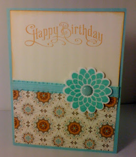 I used Pool Party CS for the base of the card. Spice Cake DSP for the bottom and strips on the inside. The Happy Birthday is from Perfectly Penned Stamp Set using More Mustard Ink Pad and the flower is from Button Buddies Stamp Set stamped with Pool Party Ink and Clear Embossing Powder. My Twin Judy made a card similar to this for my Birthday this year and I loved it. (Thanks for letting me copy you Judy!) The center of the flower I used one of the In Color Printed Designer Brads ~ love those. I used the Scallop Edge Punch on the inside strips. Also across the middle of the front of the card is Pool Party Ruffled Ribbon. Hope Wendy likes her card and has a wonderful Birthday. We don't get to see her much, she lives in New Hamshire.